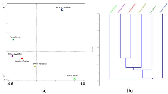 Such differentiation of the studied forests was generally consistent with the formal phytocoenological classification of these phytocoenoses, which are defined as syntaxa at the level of alliances: Piceion excelsae Pawłowski et al., 1928 and Abieti-Piceion (Br.-Bl. in Br.-Bl. et al., 1939) Soó 1964, Dicrano-Pinion sylvestris (Libbert 1933) W. Matuszkiewicz 1962, Pinion peucis Horvat 1950, Erico carneae-Piceion omorikae Mucina et Čarni 2016, Pinion heldreichii Horvat 1946 and Erico-Fraxinion orni Horvat 1959 []. However, the relationships between the analyzed forests identified in our analyses did not correspond to the higher classification proposed in the most recent hierarchical floristic classification system of the Vegetation of Europe, proposed by Mucina et al. []. First of all, our operational units Piceion omorikae, Pinion heldreichii, and Orno-Ericion, classified according to Mucina et al. [] in the common order Erico-Pinetalia Horvat 1959, class Erico-Pinetea Horvat 1959, occupied very distant places in PCoA space (Figure 4a), indicating very important differences in their floristic composition. Similarly, the very isolated position of our operational unit Pinion peucis in relation to the unit Vaccinio-Piceion with which it is classified in the common order Piceetalia excelsae Pawłowski et al., 1928 of Vaccinio-Piceetea class Bl. in Br.-Bl. et al., 1939 [] indicated a very specific floristic composition of the forests of the Macedonian pine. Finally, the grouping of our operational units Pinion heldreichii, Vaccinio-Piceion, and Pinion sylvestris in a common quadrant in the PCoA diagram (Figure 4a) and a common cluster in the cluster diagram (Figure 4b), indicatedthat these three units were floristically most similar to each other, suggesting that their floristic relationships were not consistent with their formal syntaxonomic classification into two classes, Erico-Pinetea (Pinion heldreichii) and Vaccinio-Piceetea (Vaccinio-Piceion, Pinion sylvestris).