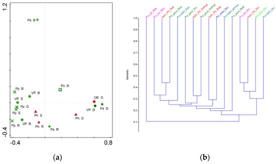 (a) Principal coordinates analysis (PCoA) for forest sub-types at the regional level (Level III) (b) Cluster analysis for forest sub-types at the regional level (Level III). VP D—Vaccinio-Piceion in Dinarides; VP S—Vaccinio-Piceion in Scardo-Pindic mountains; VP R—Vaccinio-Piceion in Rhodope mountains; VP B—Vaccinio-Piceion in Balkan mountains; Po D—Piceion omorikae in Dinarides; Ps D—Pinion sylvestris in Dinarides; Ps R—Pinion sylvestris in Rhodope mountains; Ps B—Pinion sylvestris in Balkan mountains; Pp D—Pinion peucis in Dinarides; Pp S—Pinion peucis in Scardo-Pindic mountains; Pp R—Pinion peucis in Rhodope mountains; Pp B—Pinion peucis in Balkan mountains; OE D—Orno-Ericion in Dinarides; Ph D—Pinion heldreichii in Dinarides; Ph S—Pinion heldreichii in Scardo-Pindic mountains; Ph R—Pinion heldreichii in Rhodope mountains.