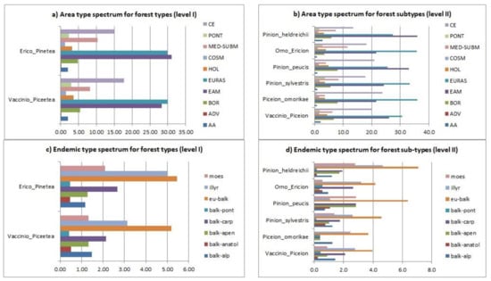 The analyses of endemism at level II (Figure 6d) showed that all forest subtypes were dominated by endemics with broad Balkan distribution (EU-balk—3.7% to 7.1%). Significant deviations from the general spectrum of endemics were shown only in Serbian spruce forests (Piceion omorikae), characterized by the complete absence of Moesian endemics and with the number of Balkan–Alpine sub-endemics being higher than that of Balkan–Carpathian sub-endemics (1.2% vs. 0.4%). Macedonian pine forests (Pinion peucis) were characterized by a higher proportion of Moesian compared to Illyrian endemics (2.8% vs. 1.1%), which was expected, due to the geographical location of Macedonian pine forest distribution.