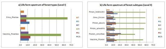 The dominance of hemicryptophytes applied to all forest subtypes, from 42.9% in Serbian spruce forests (Piceion omorikae) to 58.5% in Macedonian pine forests (Pinion peucis) (Figure 7b). Serbian spruce forests differed from the other subtypes in the high proportion of phanerophytes, which were the next dominant with 21.6%, which was expected, since Serbian spruce mainly formed mixed, poly-dominant relict forests [,]. In the other forest subtypes, the life spectra were similar to those revealed in the analyses at level I.