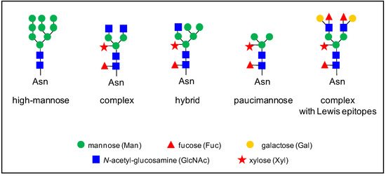 In plants, there are various types of N-glycans [9]. The biosynthesis of N-glycans has already been extensively reviewed (see for example, [9,10,11,12,13,14]), and it will not be described in detail here. Briefly, N-glycosylation process starts in the endoplasmic reticulum (ER) by the co-translational transfer of an oligosaccharide precursor of the high-mannose type, Glc(3)Man(9)GlcNAc(2) (Figure 1), onto the Asn residues of the N-glycosylation motifs of proteins. Then, these N-glycans undergo several maturation steps consisting of the removal and the addition of sugar residues in the ER and the Golgi apparatus by glycosidases and glycosyl transferases, respectively; this gives rise to complex N-glycans with Lewis epitopes. The presence of a core α(1,3)-Fuc and a β(1,2)-Xyl is specific to plant N-glycans, compared to mammal N-glycans [9]. Overall, different types of N-glycans are generated from complex N-glycans, such as hybrid and paucimannose N-glycans (Figure 1).