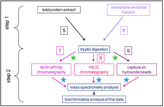 Schematic representation of different strategies used to study plant N-glycoproteomes: the affinity purification step is performed at the peptide level. Several types of workflow can be distinguished. A total protein extract (workflow 5) or a membrane-enriched fraction (workflow 6) can be used as starting points. After tryptic digestion, the enrichment in N-glycopeptides can be performed using two kinds of chromatography: a lectin affinity chromatography (workflow 7) or a HILIC (workflow 8). N-glycopeptides can also be captured on hydrazide beads (workflow 9). At the final step, the samples are analyzed using MS and bioinformatics. The green stars indicate that a step of peptide labelling can be performed to obtain quantitative data. The blue stars indicate possible treatment with enzymes (e.g., endo H or PNGases) to remove N-glycans before the analysis of deglycosylated glycopeptides or N-glycans using MS and bioinformatics.