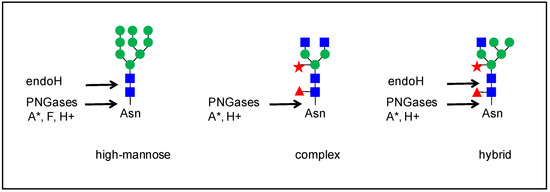 N-glycans can be removed from glycopeptides by an enzymatic digestion with endo-glycosidase H (endo H, from Streptomyces plicatus) [26], peptide: N-glycosidase (PNGase) A (from almonds) [32,34,35,36], or PNGase F (from Flavobacterium meningosepticum) [26,33,34,36,37,38] (Figure 4). Endo-H cleaves the chitobiose core of high mannose and some hybrid N-glycans. PNGases have the ability to cleave the bond between the innermost GlcNAc and the Asn residue. However, PNGase F is sensitive to the presence of α-1,3-Fuc on the core GlcNAc, whereas PNGase A is not, but is more efficient on small glycopeptides. PNGase H+ (from Terriglobus roseus) combines the properties of PNGases F and A since it is efficient on glycoproteins and on N-glycans with core α-1,3-Fuc [39]. However, this enzyme has only been used in a few studies (e.g., [40]). The activity of these enzymes results in the modifications of glycopeptides by converting Asn to Asp in the case of PGNAses and leaving one GlcNAc on the Asn residue in the case of Endo-H [36,41]. This information allows the determination of the occupancy of N-glycosylation sites.