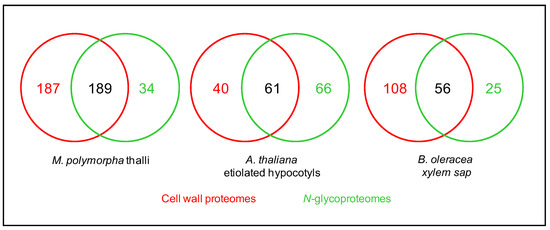 Comparison between cell wall proteomes (red) and N-glycoproteomes (green) characterized from the same plant material. In each case, the overall coverage of the cell wall proteome increases by combining the two approaches.