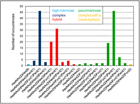 All the N-glycans studied are grafted on an Asn amino acid residue, but their monosaccharide composition is variable (see Section 1). In Ma et al. [59], 161 possible structures have been collected in a library to allow the identification of N-glycopeptides and N-glycans in A. thaliana seedlings using MS.