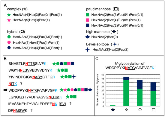 In addition, a given N-glycosylation motif can be occupied by different types of N-glycans, and this feature has been called microheterogeneity [43]. Figure 7 illustrates this microheterogenity in the case of the At1g68560 protein. Each of the glycosites can be occupied by a great diversity of N-glycans as illustrated in Figure 7A,B. In each case, three types of N-glycans are always found: hybrid-, complex-, and paucimannose-type. Moreover, for a given glycosite, a major form of each N-glycan type is identified. Figure 7C illustrates this point for one of the glycosites: HexNAc(4)Hex(3)Fuc(1)Pent(1) for complex-type; HexNAc(3)Hex(3)Fuc(1)Pent(1) for hybrid-type; and HexNAc(2)Hex(3)Fuc(1)Pent(1) for paucimannose type. In addition to this particular study, this microheterogeneity has been observed for a tomato recombinant protein called XEGIP (xyloglucan-specific endoglucanases inhibitor) produced in Nicotiana benthamiana leaves, with a collection of high mannose N-glycans (HexNAc(2)(Hex(4-9)) being grafted onto four different N-glycosites [32].