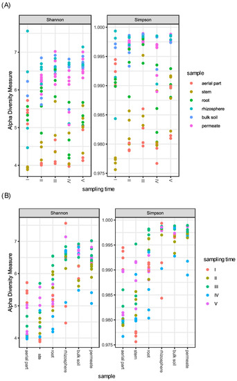 Shannon and Simpson diversity indices of the bacterial communities associated to P. australis, soil, and permeate samples collected in the CW during five samplings. (A) Samples are divided per sampling time. (B) Samples are divided per compartments.