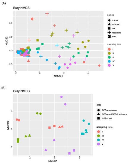 NMDS beta diversity of the bacterial communities of P. australis, soil and permeate samples. Samples were divided on the basis of the sampling site of the CW plant: (A) those collected directly from the SFS (plant tissues and soils) and (B) those collected from the CW irroration system (permeates).
