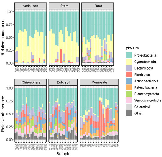 The relative abundances of detected phyla are reported in Figure 3, where they appear to be more similar with one another among the plant tissues (i.e., aerial part, stem, and root), showing higher relative abundances for Proteobacteria and Cyanobacteria. On the contrary, soil and permeate samples showed higher levels of diversity, in agreement with results regarding alpha diversity reported in Section 2.1.