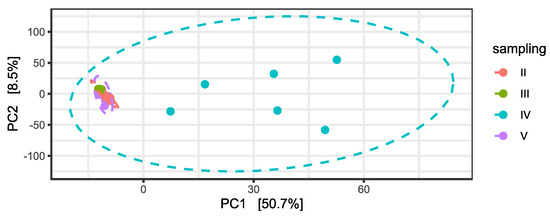 Subsequently, differential abundance analysis was performed on permeates samples during time. Differences between permeates were statistically significant, particularly in relation to the fourth and the fifth samplings, as confirmed by a PERMANOVA on the PCA to the centered log-ratio (Table S5 and Figure 4).
