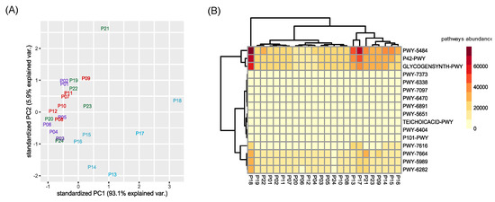 Clustering of pathways abundance. (A) Principal Component Analysis (PCA) was performed considering the predicted functional abundances of all identified pathways. In violet permeates of the second sampling, in red for the third, in blue for the fourth, and in green for the fifth. (B) Heatmap considering only the top three pathways that differentiate each contrast between varieties returned by SIMPER test. Codes of represented pathways refer to the MetaCyc Metabolic Pathway Database.