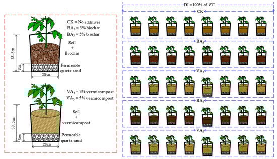 The main treatments used biochar and vermicompost. This experiment included the following five treatments: CK (0% rate, 12 kg soil + no addition), BA3 (3% rate, 12 kg soil + 360 g biochar), VA3 (3% rate, 12 kg soil + 360 g vermicompost), BA5 (5% rate, 12 kg soil + 600 g biochar), and VA5 (5% rate, 12 kg soil + 600 g vermicompost) on a mass basis. Each pot (cylindrical, top diameter: 32.5 cm, bottom diameter: 28 cm, height: 38.5 cm) was filled with quartz sand to a height of 8 cm, considering the water permeability and air permeability of the roots. The soil was air-dried and passed through a 6.3 mm sieve, and then biochar and vermicompost were weighed and mixed with soil thoroughly in proportion, respectively, and added to the pot with a natural bulk density based on each treatment. The pots were placed in a non-temperature-controlled greenhouse under natural light conditions and arranged in a completely randomized block design. Each treatment was replicated eight times (Figure 1).