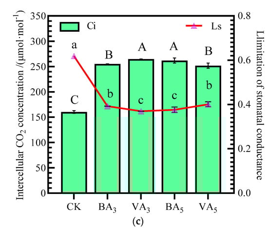 Effects of BA and VA rates on photosynthetic parameters of tomato leaves: (a) Effects of BA and VA rates on the Pn. (b) Effects of BA and VA rates on the Tr and Gs. (c) Effects of BA and VA rates on the Ci and Ls. Note: BA represents biochar application and VA vermicompost application. The meanings of the circles, triangles, and rectangles on the bars in (a) are indicated as duplicate data points for the different treatments. Means of Pn, Gs, and Ls are significantly different between BA and VA rates (p ≤ 0.05) when followed by different lowercase letters. Means of Tr and Ci are significantly different between BA and VA rates (p ≤ 0.05) when followed by different uppercase letters.Meanwhile, the increase in Pn in BA3, VA3, BA5, and VA5 was accompanied by a decrease in Ls and an increase in Ci, Tr, and Gs. As shown in (b), the highest and lowest Tr rates were observed for BA3 and CK treatments, respectively, and BA3 and VA3 showed no statistically significant difference. Gs under BA3 treatment was the highest, whereas that under CK treatment was the lowest. For Ci (c), the highest Ci was observed for treatments under VA3, followed by plants under BA5, BA3, and VA5, whereas the lowest values were observed under CK. Ls under BA3, VA3, BA5, and VA5 treatments decreased by 37%, 40%, 39%, and 35%, respectively, compared with that under CK treatment.