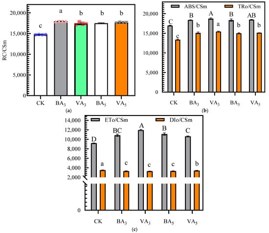 As shown in Figure 3a, RC/CSm, ABC/CSm, TRo/CSm, and ETo/CSm were increased, and DIo/CSm was decreased by biochar and vermicompost application. BA3 treatment had the highest RC/CSm, which was significantly higher than CK by 22%, and VA3 and VA5 showed no statistically significant difference. ABC/CSm, TRo/CSm, and ETo/CSm of VA3 were significantly (p < 0.05) higher than other treatments (Figure 3b,c). The highest ABC/CSm, TRo/CSm, and ETo/CSm were observed in VA3 treatment, which increased by 10%, 15%, and 30%, respectively, compared with CK treatment. Meanwhile, the increase in ABC/CSm, TRo/CSm, and ETo/CSm in BA3, VA3, BA5, and VA5 treatments were accompanied by a decrease in DIo/CSm, in which VA3 treatment had the lowest DIo/CSm, with a decrease of 6% compared with CK, indicating that the application of biochar and vermicompost was effective in reducing the heat dissipation energy per cross section.