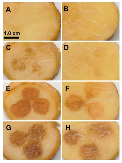 - Thangavel, T.; Tegg, R.S.; Wilson, C.R. Toughing it out—Disease-resistant potato mutants have enhanced tuber skin defenses. Phytopathology 2016, 106, 474–483. [Google Scholar] [CrossRef]