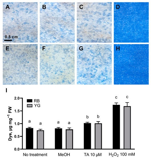 - Jacyn Baker, C.; Mock, N.M. An improved method for monitoring cell death in cell suspension and leaf disc assays using Evans blue. Plant Cell Tiss. Organ Cult. 1994, 39, 7–12. [Google Scholar] [CrossRef]