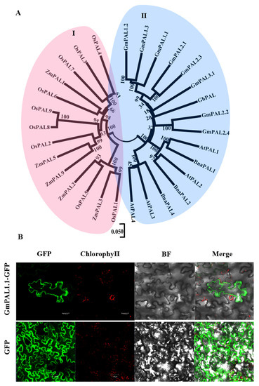 A phylogenetic tree was constructed to trace the evolutionary relationships among the PAL families in crops, such as soybean, Arabidopsis, maize, rape, and rice. Thirty PALs were selected, including eight from soybean, four from Arabidopsis, nine from rice, three from rape, and five from maize. The results showed these PALs were divided into two groups with GmPALs, AtPALs, and BnaPALs belonging to the same groups (Figure 1A). The GmPAL1.1–GFP fusion protein was constructed and transferred into the leaves of tobacco. The GFP protein was observed to be distributed in the cell membrane, cytoplasm, and nucleus, while the GmPAL1.1-GFP fusion protein was targeted to the cytoplasm and cell membrane (Figure 1B). The results indicated that GmPAL1.1 was located in the cytoplasm and cell membrane.