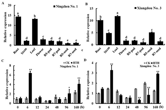 Expression analysis of GmPAL1.1. (A,B) Relative expression of GmPAL1.1 in different tissues of soybean cultivars, Ningzhen No. 1 and Xiangdou No. 3. Different tissue samples of soybean grown under the same growth conditions were obtained for qRT-PCR analysis. (C,D) Relative expression levels in developing seeds of GmPAL1.1 in Xiangdou No. 3 and Ningzhen No. 1 under HTH stress. Soybean plants grown to physiological maturity (R7) stage were treated with HTH stress (40 °C/24 °C, 98% RH/70% RH, light for 16 h/dark for 8 h) for 7 d, and during the treatment, samples of developing seeds were obtained at 0, 6, 12, 24, 48, 96, and 168 h, respectively. The control (CK) plants were grown under normal condition. Values are mean ± SD of three independent biological replicates. The means with different lowercases indicated significant differences at 5% probability level. * & ** indicated significant differences at 5% and 1% probability levels between treatment and corresponding CK, respectively.
