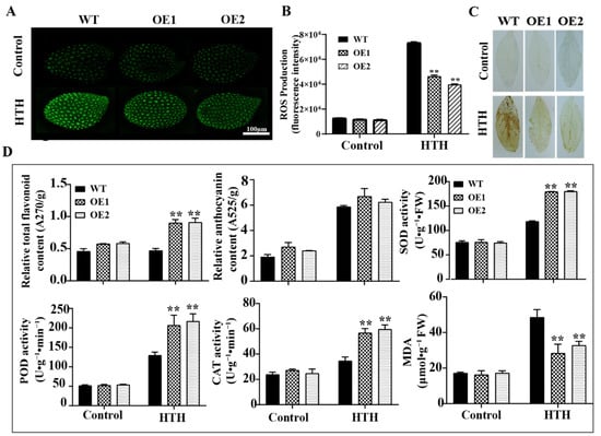 ROS content and physiological indexes of GmPAL1.1 overexpressing Arabidopsis (OE) lines and WT at physiological maturity stage after HTH stress. Control plants (WT and OE lines) were placed in a normal growth chamber (26 °C/24 °C, RH 70%, light for 16 h/dark for 8 h) for 3 d, and HTH-stressed plants (WT and OE lines) were put into artificial aging equipment (40 °C/24 °C, 98% RH/70% RH, light for 16 h/dark for 8 h) for 3 d. (A,B) ROS content in developing seeds. Developing seeds of Arabidopsis thaliana were incubated for 30 min in H2DCFDA buffer (10 mM H2DCFDA, 10 mM Hepes-NaOH, pH 5.7), photographed and observed using a laser confocal microscope, and the fluorescence intensity was measured by ImageJ. (C) DAB staining of leaves. (D) Flavonoids and anthocyanins content, antioxidant enzyme activities, and MDA content in leaves. Values are mean ± SD of three independent biological replicates, ** indicated significant differences at 1% probability levels between WT and transgenic Arabidopsis lines under HTH treatments.