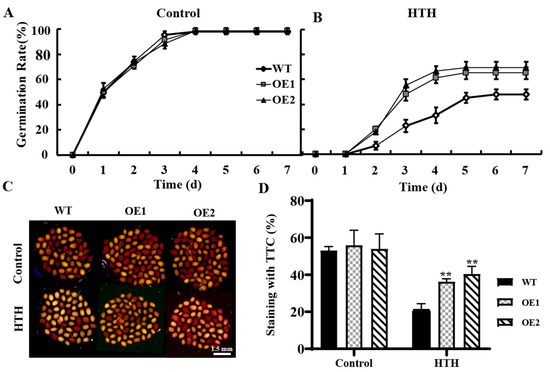 The surface-sterilized seeds of wild type (WT) and transgenic Arabidopsis lines were planted on 1/2 MS medium. The seven-day-old transgenic and wild-type seedlings were transferred to pots and grew under normal condition (26 °C/24 °C, RH 70%, light for 16 h/dark for 8 h) to the physiological maturity stage. The HTH treatments of the WT and OE lines were conducted in an artificial aging equipment (40 °C/24 °C, 98% RH/70% RH, light for 16 h/dark for 8 h) at the physiological maturity stage for 3 d. Then, all the plants grew under normal conditions, and seeds were harvested at seed full-maturity stage for further experiments.
