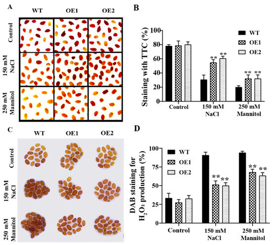 To further verify the function of GmPAL1.1 in improving seed vigor, germination performance of the mature seeds harvested from the normal-grown WT and OE lines was investigated under salt and drought stresses. TTC staining indicated that there was no significant (p > 0.05) difference in seed viability between the OE lines and WT under the control conditions. However, under the salt and drought stresses, the OE lines maintained a higher (p < 0.01) degree of seed staining than the WT (Figure 5A,B). Moreover, DAB staining demonstrated that the WT seeds accumulated higher (p < 0.01) concentration of H2O2 than the OE lines (Figure 5C,D), indicating the overexpression of GmPAL1.1 reduced the ROS accumulation in seeds during germination under salt and drought stresses.