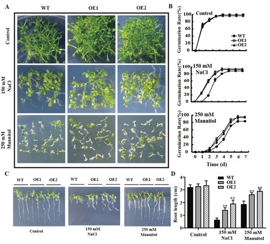 Moreover, the seeds of the WT and OE lines were exposed to 150 mM NaCl and 250 mM mannitol, respectively, and then, their germination rates and root lengths were investigated. No significant differences (p > 0.05) were found in the germination rates and root lengths between the OE lines and WT under the control condition. However, under the salt and drought treatments, the germination rates and root lengths of the OE lines were higher than those of the WT (Figure 6).