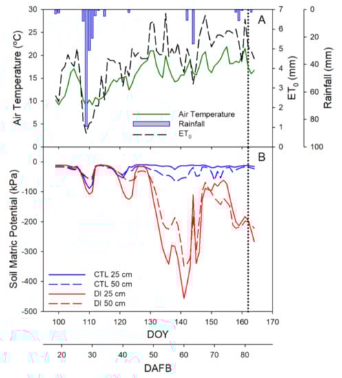 Seasonal evolution of environmental conditions (A): daily air temperature (green solid line), reference evapotranspiration (black dashed line) and rainfall (blue bars), and soil matric potential (B) at 0.25 m (solid line) and 0.50 m (dash line) depth for the two irrigation treatments, CTL (full irrigated treatment; blue) and DI (deficit irrigation treatment; red). The vertical dotted line indicates the harvest day (day of year, DOY 162; days after full bloom, 81 DAFB). Full bloom: 22 March 2019; harvest day: 11 June 2019.