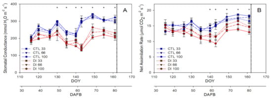 Seasonal evolution of stomatal conductance (A) and net assimilation rate (B) for the two irrigation treatments: CTL (full irrigated treatment; blue) and DI (deficit irrigation treatment; red), and the three levels of crop load: low (33%, squares), medium (66%, triangle), and high (100%, circle). Each point is the mean ± SD of three trees. Asterisks indicate significant differences between CTL and DI, according to ANOVA (p < 0.05). The vertical dotted line indicates the harvest day (day of year, DOY 162; days after full bloom, 81 DAFB). Full bloom: 22 March 2019; harvest day: 11 June 2019.
