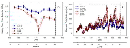 Seasonal evolution of midday stem water potential (A) and maximum daily branch shrinkage (B) for the two irrigation treatments: CTL (full irrigated treatment; blue) and DI (deficit irrigation treatment; red), and the three levels of crop load: low (33%, squares), medium (66%, triangle), and high (100%, circle). Each point is the mean ± SD of three trees. Asterisks indicate significant differences between CTL and DI, according to ANOVA (p < 0.05). The vertical dotted line indicates the harvest day (day of year, DOY 162; days after full bloom, 81 DAFB). Full bloom: 22 March 2019; harvest day: 11 June 2019.