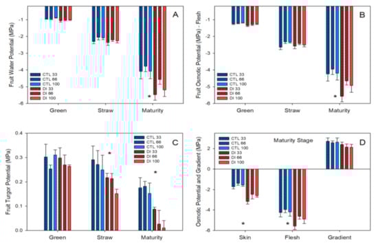 Fruit water potential (A), fruit osmotic potential (B), fruit turgor potential (C), and fruit osmotic potential gradient between skin and flesh at harvest (D) for the two irrigation treatments: CTL (full irrigated treatment; blue) and DI (deficit irrigation treatment; red), and the three levels of crop load: low (33%), medium (66%), and high (100%). Each bar is the mean ± SD of six fruits. Asterisks indicate significant differences between CTL and DI, according to ANOVA (p < 0.05).