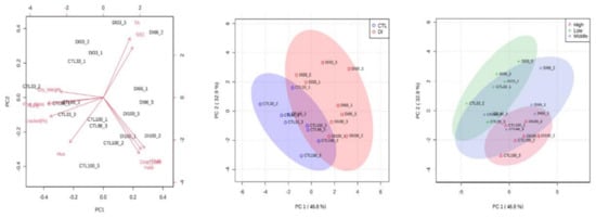 Principal component analysis (PCA) biplot of the fruit quality characteristics, expressed as vectors, of fruit from the two irrigation treatments, CTL (full irrigated treatment) and DI (deficit irrigation treatment), and the three levels of crop load: low (33%), medium (66%), and high (100%). The two principal components of the PCA explained 79.7% of the variation in the measured data.