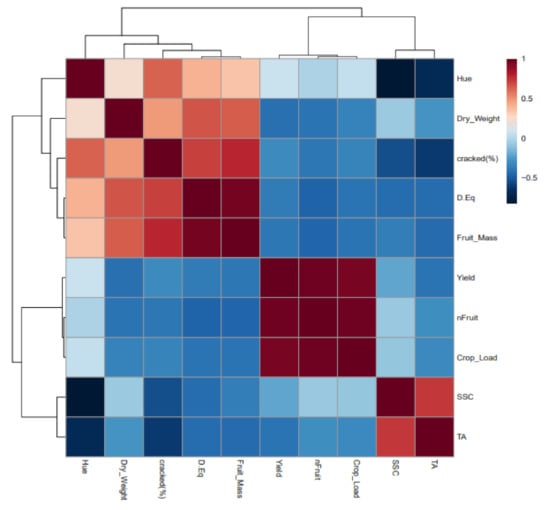 At harvest, analysis of variance (ANOVA) and multivariate analysis of variance (MANOVA) were carried out to determine significant (p = 0.05) differences between the treatments. The degree of agreement between the independent variables (crop load) and the dependent variables (fruit cracked at harvest, cracking index, osmotic potential) was assessed using regression analysis. Statistical analyses were carried out using IBM SPSS Statistics v24 (Armonk, NY, USA). Principal component analysis (PCA) was carried out in RStudio package (RStudio Inc., Boston, MA, USA).