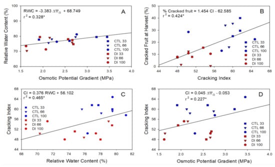 Linear regression between the fruit osmotic potential gradient (∆Ψπ) and the fruit relative water content (RWC) (A), the cracking index (CI) assessed in the laboratory and the proportion of fruit cracked at harvest (B), the fruit relative water content and the cracking index (C), and the osmotic potential gradient and the cracking index (D) for the two irrigation treatments: CTL (full irrigated treatment; blue) and DI (deficit irrigation treatment; red), and the three levels of crop load: low (33% square), medium (66% triangle), and high (100% circle). Each point represents one replicate (tree). * indicates a significant relationship between the studied variables at p < 0.05.