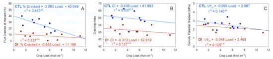 Within each irrigation treatment, a negative linear relationship was found between crop load and both the proportion of cracked fruits at harvest and the cracking index (Figure 8). Trees with lower crop loads showed higher levels of cracking, which highlights the influence of the crop load on the trend of the fruits to crack. The trend toward a higher proportion of cracked cherries at harvest for those trees with a light crop load (<four fruit cm−2 TCSA) was stronger for CTL trees compared with DI trees. When both linear regression lines were compared, the linear regression line of CTL trees had an intercept and slope four and six times higher, respectively, than those of DI trees.