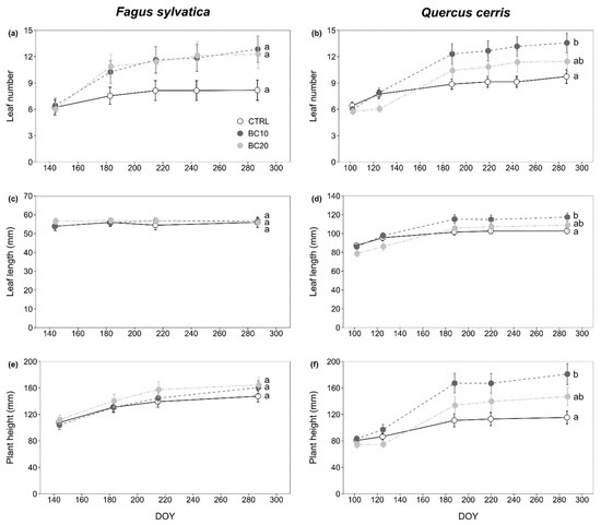 Morphometric parameters (mean ± standard error) over time (day of year, DOY) for Fagus sylvatica (a,c,e) and Quercus cerris (b,d,f) grown in soils amended with 0% (CTRL), 10% (BC10), and 20% (BC20); different letters indicate statistically significant differences between treatments (p < 0.05).