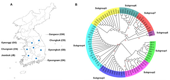 Geographical locations of seven provinces and phylogenetic relationship of 83 SMV CP sequences. (A) Geographical locations of seven provinces in Korea in which samples were collected. (B) Maximum likelihood phylogenetic tree of 83 SMV CP nucleotide sequences. The eight identified subgroups are indicated by different colors. Bootstrap values > 75% were indicated.