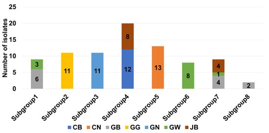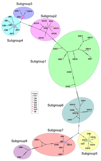 Haplotype network is a useful method for determining the relationships between different virus populations. A minimum spanning network of 83 SMV sequences was generated. The haplotype network also revealed eight subgroups defined by 50 haplotypes (Figure 3). The high-frequency haplotypes were CB1 (14 sequences) in subgroup 4, GN1 (nine sequences) in subgroup 3, and CN11 (eight sequences) in subgroup 5 (Table S2). Three haplotypes (GW12, JB5, and GG12) contained three sequences, while two haplotypes (GG16 and GG20) contained two. High-frequency haplotypes with multiple connections might be older. For example, CB1 was connected with seven different haplotypes (Figure 3). In contrast, two haplotypes (GB4 and GB8) in subgroup 8 may be newer. Moreover, two haplotypes (GN3 and GN12) in subgroup 3 may have recently evolved from GN1. The haplotypes in subgroups 1 and 7 had a broader distribution, indicating a high degree of genetic diversity among haplotypes. However, the haplotypes in subgroups 4 and 5 had a narrower distribution, suggesting a low degree of genetic diversity among haplotypes. The hatch marks in the network indicate the number of mutations between haplotypes. For example, three haplotypes (CN1, CN8, and CN14) in subgroup 5 labeled by a single bar indicated that the three haplotypes had recently evolved from CN11 with a single mutation. In contrast, GW11 in subgroup 6 had 19 hatch marks (mutations), which may have evolved from GW12 with a high level of mutations.