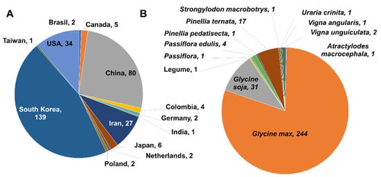 Information of 305 SMV CP sequences used for phylogenetic analysis. Pie chart displays the distribution of 305 SMV sequences according to countries (A) and plant host (B).