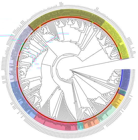 The aligned 83 SMV CP sequences from this study and 305 SMV CP sequences were subjected to phylogenetic tree construction using IQ-Tree version 2.0 [31]. The generated maximum likelihood phylogenetic tree was imported into Figtree version 1.4.4 (http://tree.bio.ed.ac.uk/software/figtree/). The phylogenetic tree was modified using Evolview version 3 [32].