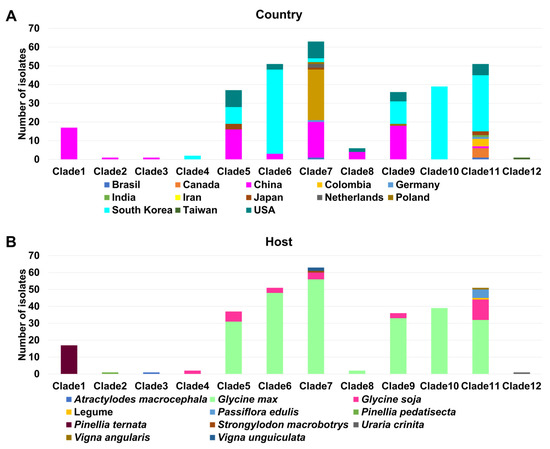 Composition of 305 SMV sequences in each clade. The composition of SMV sequences in each clade according to the country (A) and plant host (B) was examined.