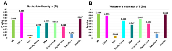 Next, we calculated the average number of segregating sites (θw) for each group (Figure 7B). The average number of segregating sites in ‘all’ (θw = 0.084) was the highest among the nine groups, followed by the Pinellia species (θw = 0.083), China (θw = 0.079), and G. max (θw = 0.067). Iran (θw = 0.009) had the lowest average number of segregating sites, followed by the Passiflora species (θw = 0.014).