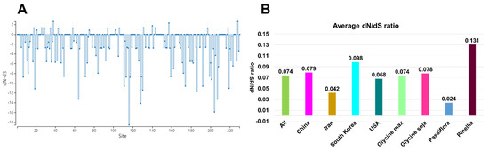 We compared the nucleotide diversity π (Pi) in eight different groups grouped by country or plant host (Figure 7A). Compared to 305 SMV CP sequences defined by ‘all’ (Pi = 0.063), the Pi values in most groups were less than 0.063, except for China (Pi = 0.089) and the Pineallia species (Pi = 0.067). Among the four countries, nucleotide diversity was highest in China and lowest in Iran (Pi = 0.004). Similarly, the nucleotide diversity of the Pinellia species (Pi = 0.067) was the highest, whereas that of the Passiflora species (Pi = 0.013) was the lowest.
