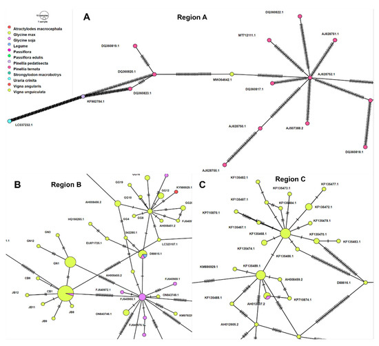 Haplotype network of 305 SMV CP sequences. Minimum spanning networks were implemented in PopART. Three regions, defined as region A (A), region B (B), and region C (C), were magnified from the complete haplotype network shown in Figure S3. Haplotype colors correspond to different plant hosts. The sample sizes in the given haplotype are indicated by the circle size. Each mutation is marked by hatch marks. The original network can be found in Figure S3.