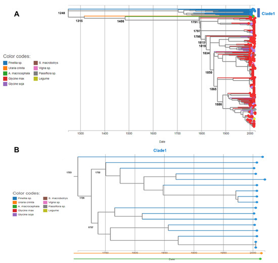 Phylogenomic analyses of 305 SMV CP sequences. (A) A maximum likelihood phylogenetic tree with estimated divergence time for 305 SMV CP sequences was created using TreeTime. Individual sequences are indicated by circles and plant hosts are indicated by different colors. Major nodes (branching points) are indicated by the estimated time. (B) Time-resolved tree of clade 1.