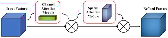 Suppose the input feature map of the network is: , where F refers to the input feature graph, and R represents the set of real numbers, which represents the feature graph with the number of channels C, the height H, and the width W. Then the channel feature map is generated after passing through the first channel attention module: . The spatial feature map is generated after passing through the second spatial attention module: . The formula can be expressed as follows: