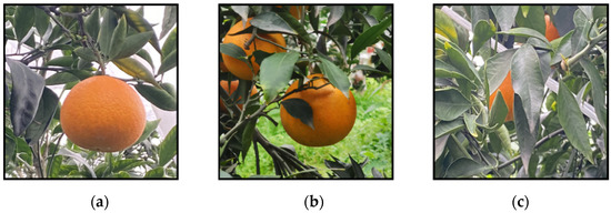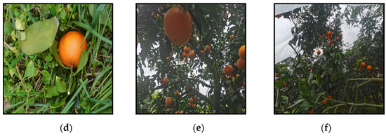 In this experiment, we produced a dataset of citrus fruits in a citrus orchard setting. Images of citrus fruits were captured and collected using three Huawei NOVA7 mobile phones equipped with high-definition rear cameras. The maximum pixel value of the camera is 64 million, and the resolution of the fruit image is 4032 × 4032. The dataset was taken around November 2021, which is a good time for the citrus harvest. All images were acquired under natural daylight conditions when the outdoor environment was well-lit and warm. The location was in Danling County, Meishan city, Sichuan Province, which is a large county famous for citrus cultivation in China. The dataset includes four kinds of interference, namely overlap, occlusion, light-dark change, and distance change, which can best reproduce the conditions of citrus fruits as seen by human eyes in their natural environment. Part of the dataset is shown in Figure 4.