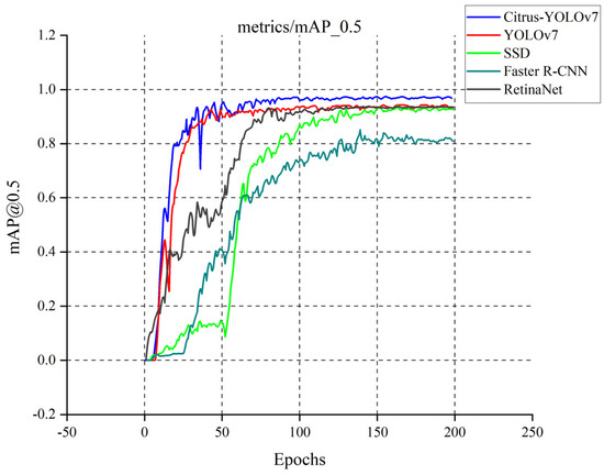We compare the four most advanced object detectors with our improved model and draw a line chart with mAP@0.5 as the index. First of all, according to the five curves in different colors in Figure 8, the YOLOv7 series model has certain advantages in citrus detection, while the other SSD model [39], Faster R-CNN model [40], and RetinaNet model [41] have their defects in detection. As shown in Figure 9, Figure 10 and Figure 11, although the SSD model and RetinaNet model are close to the YOLOv7 series model in detection accuracy after 200 rounds of training, their convergence speed is slow and the early training fluctuates greatly. The Faster R-CNN model does not have an advantage in this problem, due to its network structure: because its RPN extraction network cannot produce a multi-layer fusion feature map, therefore it seems to be limited. The convergence speed of the improved Citrus-YOLOv7 model is significantly faster than that of other models in the training process. This is because the CBAM attention mechanism is added, which can enhance the feature distribution weight of the object to be detected in the spatial and channel dimensions and throw away the interference of useless features when fitting the results, and accelerate the convergence. At the same time, the mAP@0.5 value of the improved Citrus-YOLOv7 model is higher than that of the single-stage SSD model, the RetinaNet model, and the two-stage Faster R-CNN model, and is stronger than that of the YOLOv7 model before the improvement.