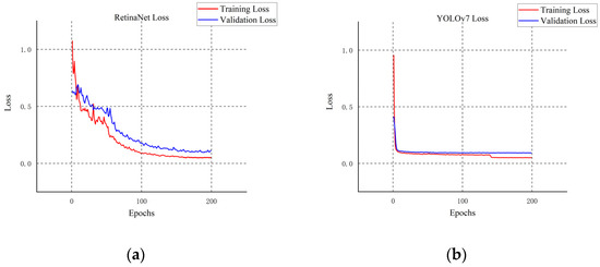 (a) The loss changes of the RetinaNet model; (b)The loss changes of the YOLOv7 model.