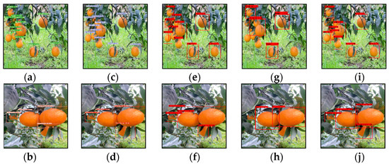 Test results of five models. (a,b) Citrus-YOLOv7; (c,d) YOLOv7; (e,f) Faster R-CNN; (g,h) SSD; (i,j) RetinaNet.