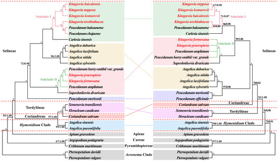 We believe that the “core” Kitagawia should be limited to Subclade I, while K. praeruptora and K. formosana should be removed from the genus. Furthermore, P. hakuunense was treated as a synonym of K. komarovii by Pimenov [18]; while our results showed that P. hakuunense should be identified as a distinct species, both P. hakuunense and P. chujaense may belong to Kitagawia. Our phylogenetic analyses confirmed that Kitagawia does not belong to the Acronema Clade but to Selineae. There was no doubt that some accessions of Kitagawia used in previous studies were misidentified [27,29,30]. Our results demonstrate the rationale behind the separation of Kitagawia and the necessity for its further taxonomic revision.